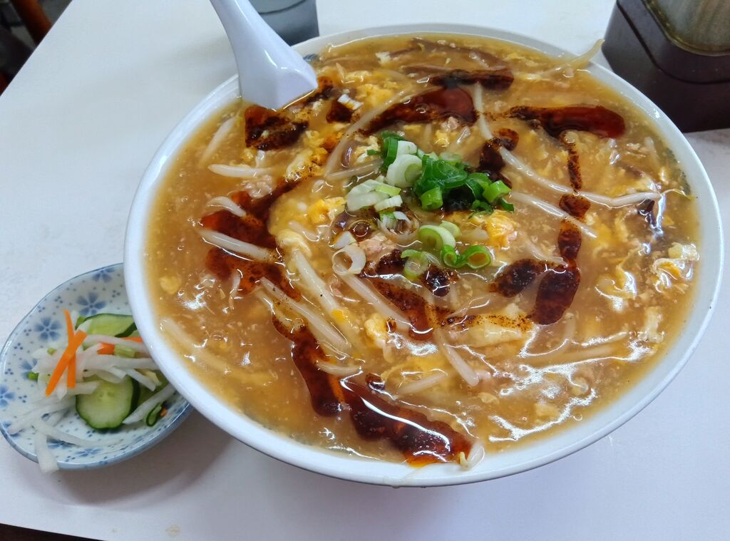 鬼怒川温泉にある街中華のお店で、地元の方も利用するお店です。店内には4人がけのテーブルが2つあるのみなので、お昼時には相席になることが多いですが、それも昔ながらの街中華ならではだと私は思います。この日食べたのは名物の酸辣湯麺(スーラータンメン:700円)です。日光市民であわじさんを利用したことある方であれば、ほぼ間違いなく一度は食べたことがあるメニューです。もちろん、酸辣湯麺の完全に虜になり、また食べたくなって何度もお店にリピートする方も数知れず。そして私もその1人です。本当美味しいんです。あわじさんに行ったら是非とも召し上がって欲しいメニューです。さて、久しぶりに食べた酸辣湯麺、いつもようにたっぷりとスープが注がれて運ばれて来ました。今にも溢れそうなトロミのあるそのスープには黒酢がたっぷり混ぜてあり、熱々の湯気と一緒に食欲をそそる香りを漂わせています。一見辛そうに見えるかも知れませんが、スープは決して辛くなく、黒酢が程良く効いた飲みやすいスープです。でも熱々なので火傷にはご注意くださいwww麺はやや細めの麺で、黒酢の効いたスープと絡み合ってすする度に口の中に良い香りが広がります。完食です。この日は暑い1日でしたが、酸辣湯麺は黒酢が食欲をそそるためか熱々でも食べやすく、また黒酢のお陰でパワーがチャージできたような気がします。美味しいラーメンです、近いうちにまた来たいと思います。