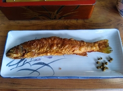 祝日のこの日、午前中に中三依と上三依で用事がありました。用事を済ませるとちょうどお昼の時間でした。9月とは言え真夏のように暑いこの日、冷たいそばをツルッと啜りたくなり、湖畔亭ほそいさんに行くことにしました。何度もお邪魔しているお店です。こちらの鴨そばが大好きなんです。この日も鴨そばを食べることにしました。また、岩魚の唐揚げが気になったのでそちらも注文しました。程なくして運ばれてきた鴨そば、安定の美味しさです。私は何度も湖畔亭ほそいさんにお邪魔していますが、食べるものはいつも鴨そばです。お蕎麦が大好きな私は中でも鴨そばが大好きで、その中でもこちらのお店の鴨そばは本当に美味しいと思います。そして人生初挑戦の岩魚の唐揚げ、頭からいただきます。食べてみてびっくり、とても柔らかいんです。岩魚の塩焼きだと頭や骨は固くて残すことがほとんどだと思いますが、この唐揚げは頭も骨もそのまま食べることができ、身もホクホク柔らかくて美味しいです。山椒の実をトッピングするとその香りがまた岩魚の美味しさを引き立てます。お蕎麦はいつものように完食、そして岩魚の唐揚げも何も残らず綺麗に食べてしまいましたwww湖畔亭ほそいさんに来るといつも鴨そばだけを食べていましたが、次からは岩魚の唐揚げも外せませんね♪