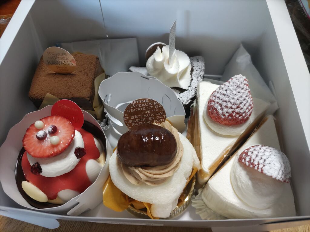 ケーキが食べたいとのリクエストでお気に入り登録していたラフィーネさんへ。行ってみたらびっくり。外まで長い行列です。ショーケースの中にはキラキラのケーキが並んでいます。悩みながらショートケーキ、いちごみるく、ガトーショコラなど計6点をチョイス。中でも笠間の大きな栗が乗ったモンブランは存在感抜群です。モンブランには珍しく求肥に包まれていて色々な食感が楽しめます。みやさんのクチコミで見た黒糖マドレーヌも忘れず購入しました。ケーキや半生菓子、焼き菓子と種類が豊富で宝箱の様なお店でした。