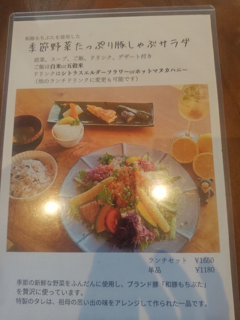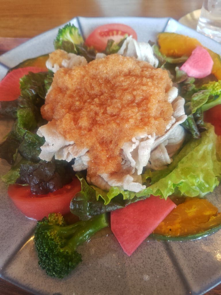 誕生月クーポン20%オフラインが来たのでかなり久しぶりですが2回目の訪問。開店時間の11:30に予約してたから大丈夫でしたが予約しないと難しいと思います。(土)だからかもしれませんが駐車場は店前のエリアは開店時間には一杯になり、以後は店裏の駐車場になっていました。頼んだのは『季節野菜たっぷり豚しゃぶサラダ』のランチセット1650円。見た目からして確かに野菜たっぷりで健康的、豚しゃぶも一杯あり大満足。デザートも美味しかったです。飲み物はオレンジジュース。今の時代ちょっとしたランチでも2000円ですがコスパ良いと思います。女性に人気があるようで9割は女性陣でした。