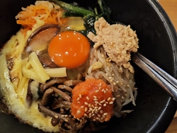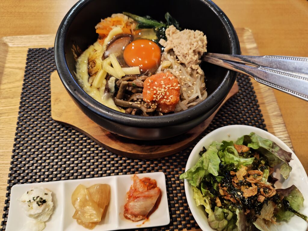 初めての訪問、丁度店前に1台分の駐車場がありラッキーで入りましたが50m手前にかなりの台数停める駐車場あるみたいだから雨でなければそちらの駐車場の方が良いかも。店前は前っつ込みで出る時はバッグだから車の往来が気になります。頼んだのは『みや御苑石焼ビビンバ』チーズビビンバと迷いましたがこちらはチーズもあり明太子も付いているから選びました。適度なオコゲが食欲そそり美味しかったし、デザートの『マンゴーソース杏仁豆腐』も美味でした。初回のお友達登録で、『巨峰ボンボンジュース』を選択、大きい果実入りで満足。初めての訪問の方はラインのお友達登録をお勧めします。また、機会あれば行きます。