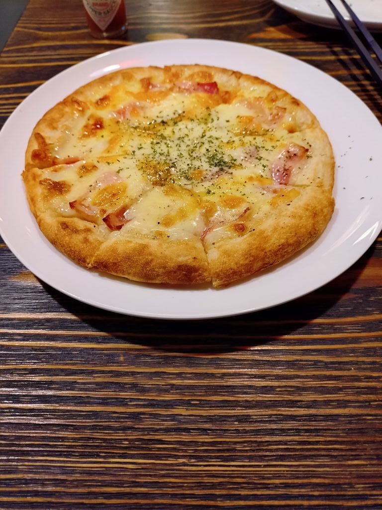 久しぶりに、ドラゴンハンバーグ食堂にて、食事をしました。今回は、いただいた美味しいメニューについて、お話をしたいと思います。いただいた美味しいメニューは、写真に掲載しました通り、チーズピザとポテトフライです。このメニューは、本日のオススメメニューであり、できたてのメニューでもありました。チーズピザは、美味しく、歯ごたえの良い生地に、とろ〜りピザとベーコンをのせた美味しいピザです。ポテトフライは、塩味のきいたポテトフライで、ケチャップ&マヨネーズと一緒にいただくと絶品です。どれも美味しいメニューです。是非、皆さんも、食べてみてください。今回も読んでいただき、誠にありがとうございました。