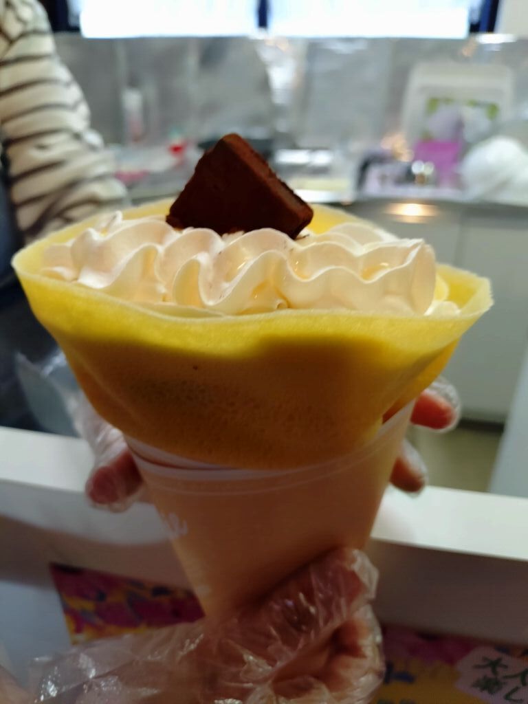 またまた、リベルテにて、美味しい創作クレープをいただきました。今回は、いただいた美味しい創作クレープについて、お話をしたいと思います。いただいた美味しい創作クレープは、写真に掲載しました通り、メープルソースにホイップクリーム2倍、バニラアイスに生チョコをトッピングしたクレープです。メープルソースは、ホイップクリーム、生チョコ、バニラアイス、いずれも相性が良く、それぞれの美味しさと甘さを出しています。最後の一口まで、美味しさと甘さを楽しめます。皆さんも、是非、食べてみてください。今回も読んでいただき、誠にありがとうございました。