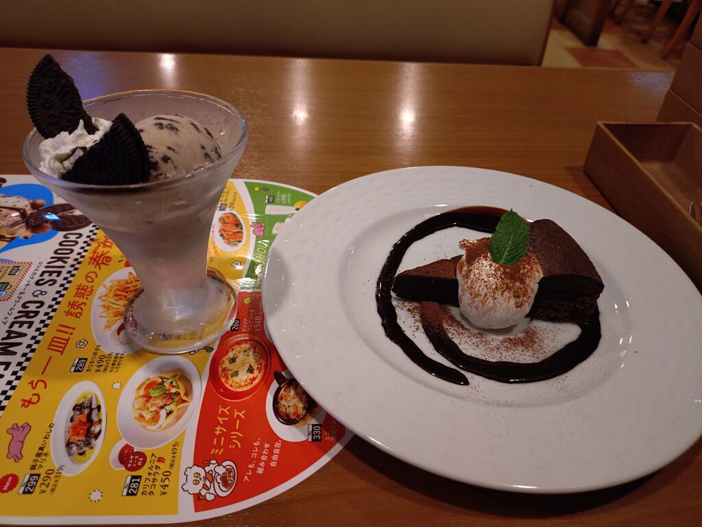 仕事帰りに、ココスにて、美味しいデザートをいただきました。今回は、いただいた美味しいデザートについて、お話をしたいと思います。いただいた美味しいデザートは、写真に掲載しました通り、ガトーショコラとクッキー&クリームアイスです。ガトーショコラは、濃厚な甘さが美味しいチョコレートケーキです。ホイップクリームとの相性もバッチリです!クッキー&クリームアイスは、冷たくて甘いクッキー&クリームアイスに加えて、クリームサンドココアクッキーにホイップクリームがあるデザートです。アイスと一緒に、クリームサンドココアクッキーやホイップクリームを食べるのも美味しい食べ方の一つです。美味しいデザートです。皆さんも、是非、食べてみてください。今回も読んでいただき、誠にありがとうございました。