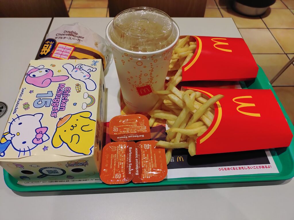 仕事帰りに、マクドナルドにて、食事をしました。今回は、マクドナルドで、いただいた美味しいメニューについて、お話をしたいと思います。いただいた美味しいメニューは、写真に掲載しました通り、夜マックメニューのポテナゲ特大に倍ダブルチーズバーガー、爽健美茶です。バーベキューソースのチキンマックナゲット15ピース、マックフライポテトLが2ケ、そして、バイダブルチーズバーガーと美味しくも食べごたえ十分なメニューです。チキンマックナゲットとバーベキューソースは最高の組み合わせです!また、バイダブルチーズバーガーも、美味しさ2倍のチーズバーガーです。とても満足した食事でした。皆さんも、是非、食べてみてください。今回も読んでいただき、誠にありがとうございました。