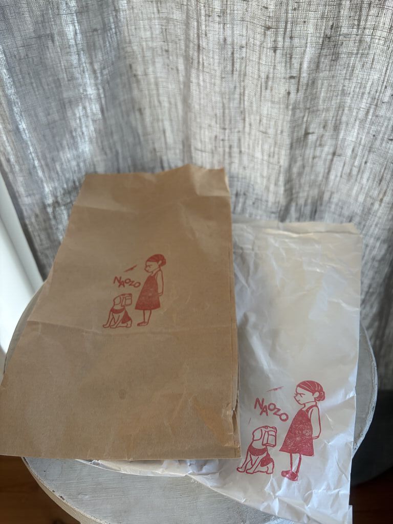 11:50、、、焼き上がり『ライブレッドひとつ用意できますよー!薪の香りゆたかなナオゾーにふらっと寄ってきました。「ハード系パン、何かありませんか?予約はしてないのですが、、、」。左上のレーズンラスクから時計回りに、バナナマフィン2個、バナナケーキ、スコーン2種、レーズンマフィンとチーズタルト、そしてレーズン酵母のほどよい酸味のライブレッド。1cmほどに薄めにスライス、クリームチーズやバターでリッチに、トマトなどの瑞々しいお野菜をのせて、もちろんオリーブオイルも美味しいですよ、、、と。おすすめないただき方を教えてくださいました。お忙しい中でもそんな会話をしてくださる温かな空間にも、とっても癒されますね。