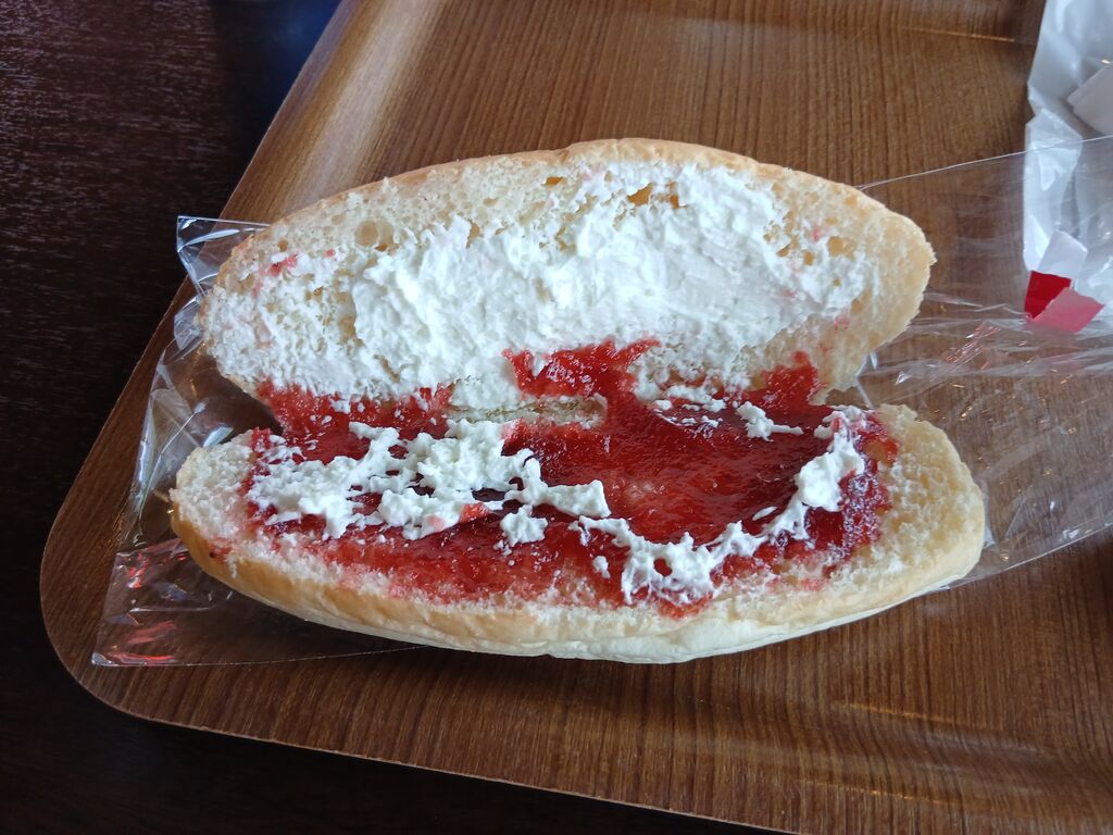 帰り道で明日の朝のパンを購入したく、「きらむぎ」さんに立ち寄りました。店内はパンの美味しい香りが漂い、ちょっと食べようかとイートインコーナーで一休み。コッペパンに好きなイチゴジャムとホイップ 粒餡をつけてもらい、アイスティーとコーヒーでいただきます。 パンがフカフカでおいしく えっ もう食べきっちゃった(笑)店員さんが親切で気持ち良く買い物ができて、おいしくパンもいただけました。明日の朝が楽しみでーす。保存食の缶詰めパンの他にこんなに美味しいパンを扱っていたなんて… また、近くへ行ったら寄りたいです。