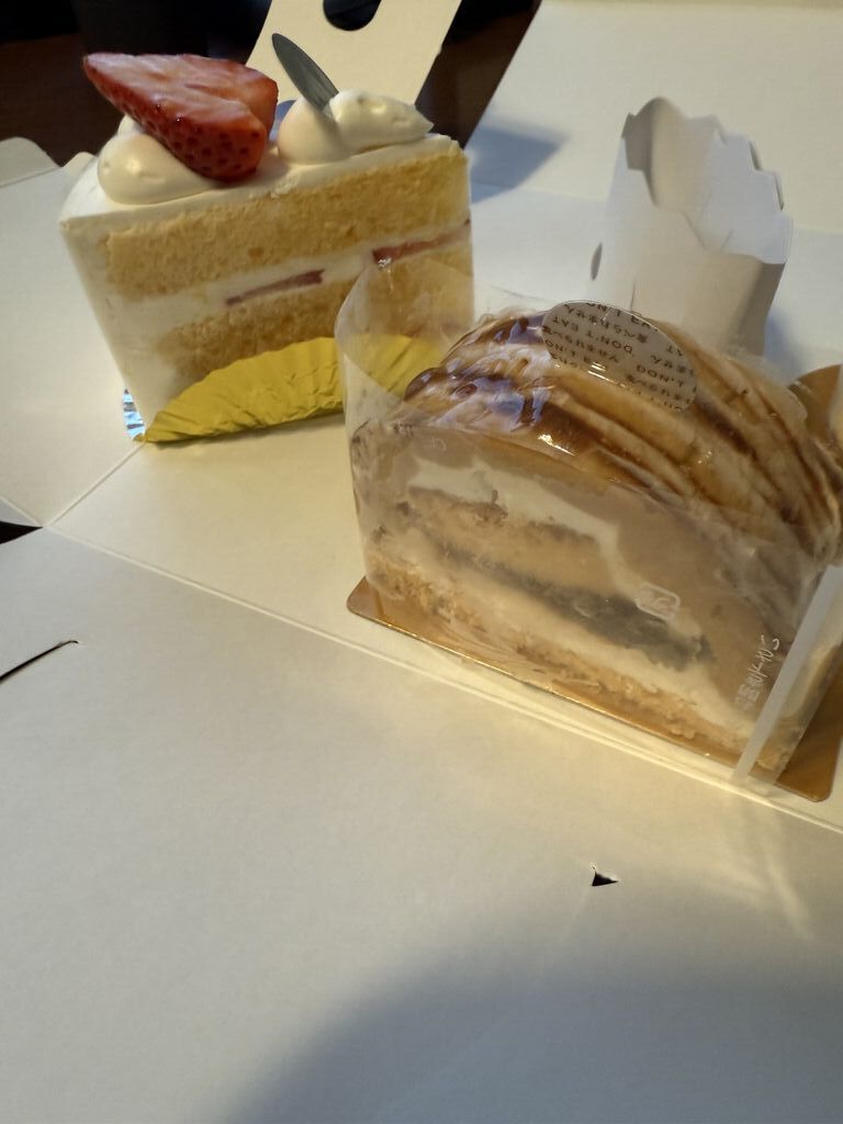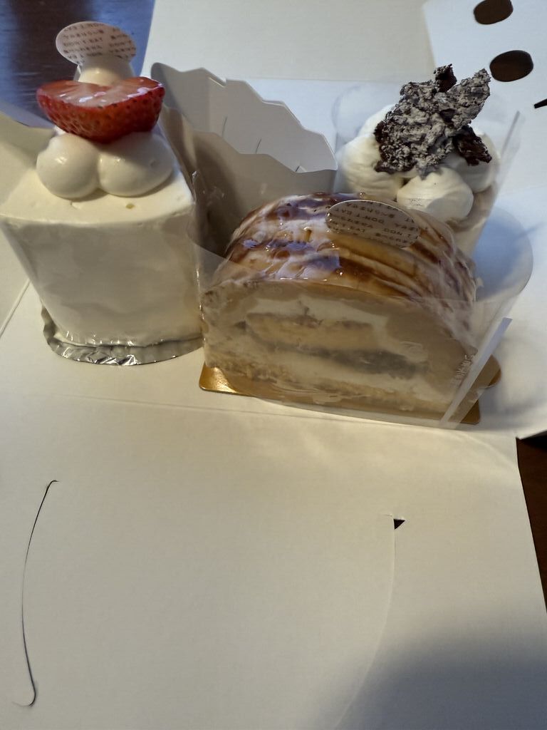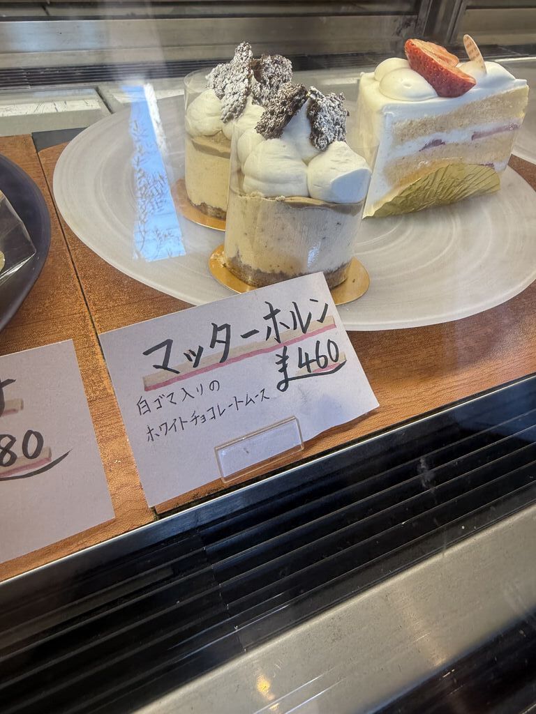 先月、ランチで食べたデザートが美味しかったので買いにいきました!私のお気に入り、マッターホルン。(これでもう忘れません!!)その他に家族用にいちごショートともう一つの名前を忘れてしまいましたが、ナッツの風味が美味しいケーキでした♪マッターホルンは白ごまの香ばしさと中のチョコムースと相性がバッチリです!上に乗ってるチョコクランチ的なカリカリも美味しかったです!ごまが好きな方におすすめですよ♪気になるケーキもたくさんあったのでまた行きます!