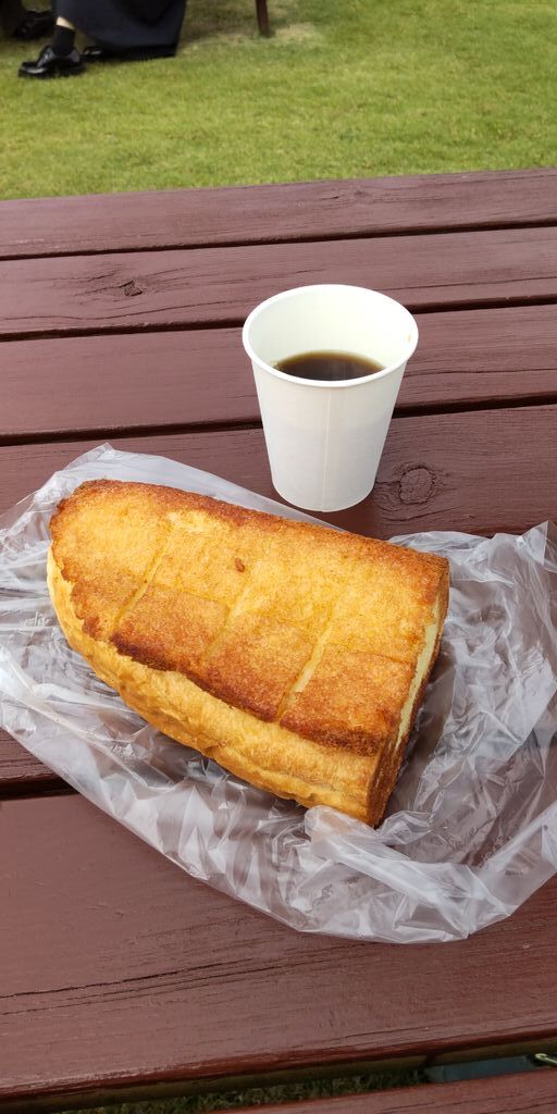 こちらのパン屋さんで朝ごはんのパンを買って食べました!朝9時からやっているのがありがたいですね♪パンは次から次へと焼き上がっていて目移りするくらいパンが豊富でした!また、パン一つ一つのお値段がリーズナブル!私はシナモントーストを買いました。一つ160円でこのボリューム!子供はまだ小さいので食パンを買って何もつけずに食べましたがしっとり柔らかくてパクパク食べていました!夫はカレーパンをそれぞれ好きなパンを買ってお土産にもパンを買って帰りました。パンを買ったらコーヒー一杯無料も嬉しいサービスです☺️