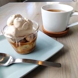 金曜日限定の韓国プレート1600円(ドリンク付き)、バノフィーパイ風グラスデザート350円を注文。プレートの上にはヤンニョムチキン、サラダ、スープ、茄子のねぎ塩ナムル、ビビンバ、チャプチェ、のような人参のハニーマスタードラペ。品数が多く、彩りも良く、食欲をそそります。ヤンニョムチキンは衣サックリで辛さはマイルド、4つものってて嬉しいです。バノフィーパイはほんのり苦味を感じるたっぷりのコーヒークリーム、バナナ、濃厚なトフィー、ビスケットのザクザク食感が後を引くおいしさです。なつめ茶は初めてですがほんのりした甘味で癖がなく、心身共にリラックスできました。
