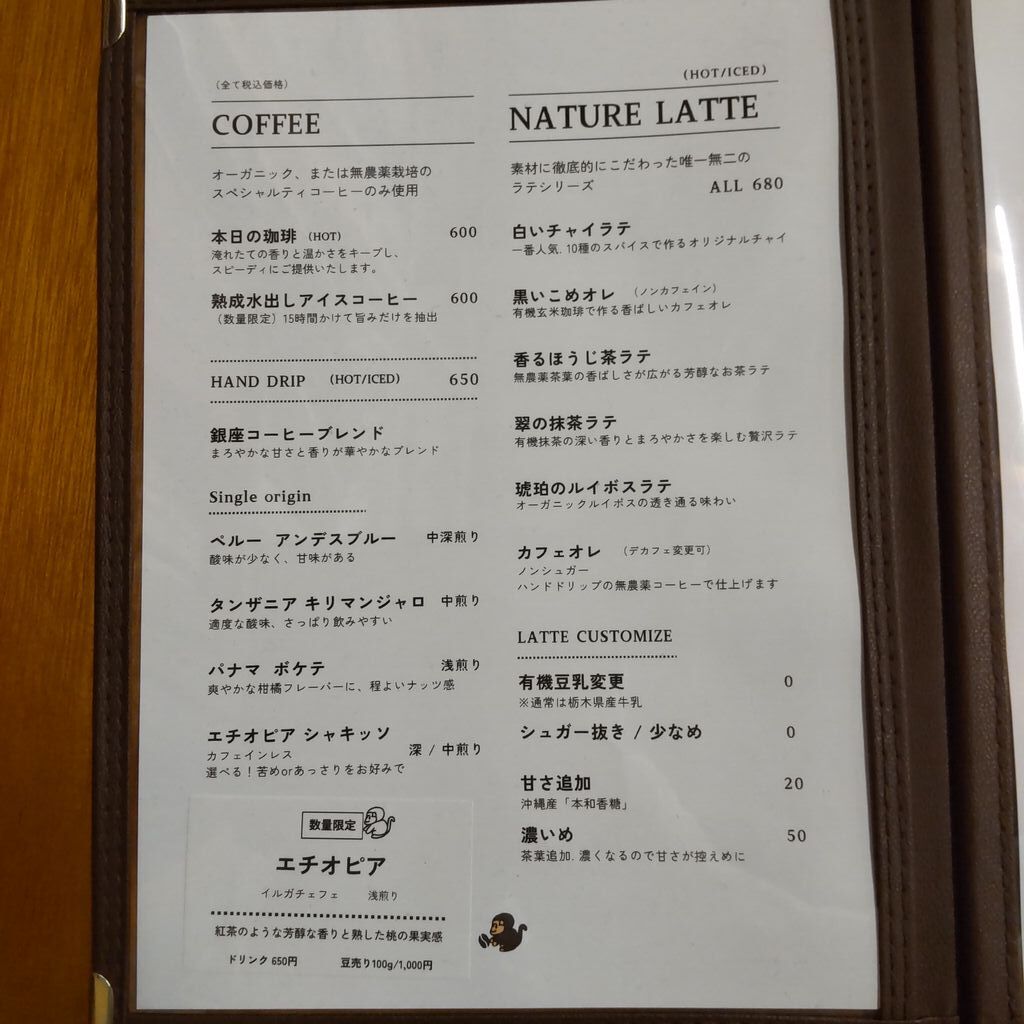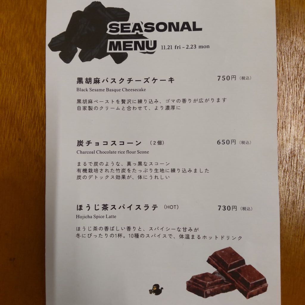 玄米珈琲(600円)、炭チョコスコーン(650円)を注文。雨で閉店に近い時間だったためか、ほぼ貸し切りでのんびりできました。玄米珈琲は苦味はほぼなく、香ばしさがあり、ものすごく濃い麦茶のような感じでした。寒い日のホットなので、より香ばしさがおいしく感じました。炭チョコスコーンはさっぱりしたクリーム(生クリームではなかったです。豆乳とかを使ってるのでしょうか)をつけてもおいしいですし、そのままでもしっかり甘いのでドリンクとよく合いました。ベーグルも食べられる(テイクアウトOK)ようなので、今度はそちらもいただいてみたいです。