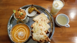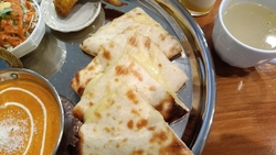 散歩途中~ランチが決まらず、以前に食べたチーズナンが食べたい!って事でオープンしたインドカレー店に訪問。ランチメニューの中の Bセットを選びカレーを《海老カレー》+200でチーズナンに変更♪飲み物は《マンゴーラッシー》辛いのが苦手な私は迷わず甘口~(笑)甘さの中に海老の風味が軽くありプリプリ海老が3つ隠れてたぁ~(笑)チーズナンは隅々までチーズたっぷりと何処から食べてもチーズチーズ~重量感半端なく幸せ~(ૢ˃ꌂ˂⁎)甘口のカレーと少し塩味かかったチーズナンとの相性は最高~!やっぱり癖になるなぁ~と私は無言で心の中で納得しちゃいました(笑)味と量のわりにリーズナブル。チーズナン是非ご賞味あれ~♬