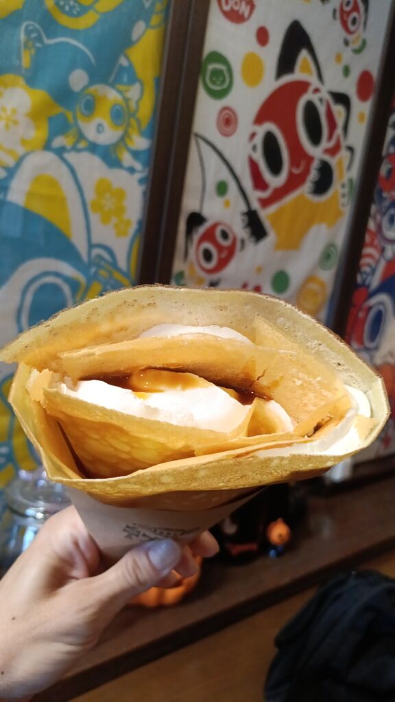 氏家駅周辺を散歩しながら発見したクレープ屋さん♪食べたぁ~い!と私の要望に寄り道~(笑)メニューの数が沢山ありテンション上がる~(٩Üو)↑シンプルな《ホイップ&ソースクレープ(キャラメル)》に決定!注文受けてから丁寧に作っているので出来たてが食べれるのが嬉しい~(笑)キブナに囲まれた店内の雰囲気もステキ~♪パリパリした生地とモチモチした生地の混合で生クリームは最後までしっかり詰まっていて文句なし~(ૢ˃ꌂ˂⁎)最後の一口まで飽きる事なく贅沢に食べちゃいましたぁ~(笑)