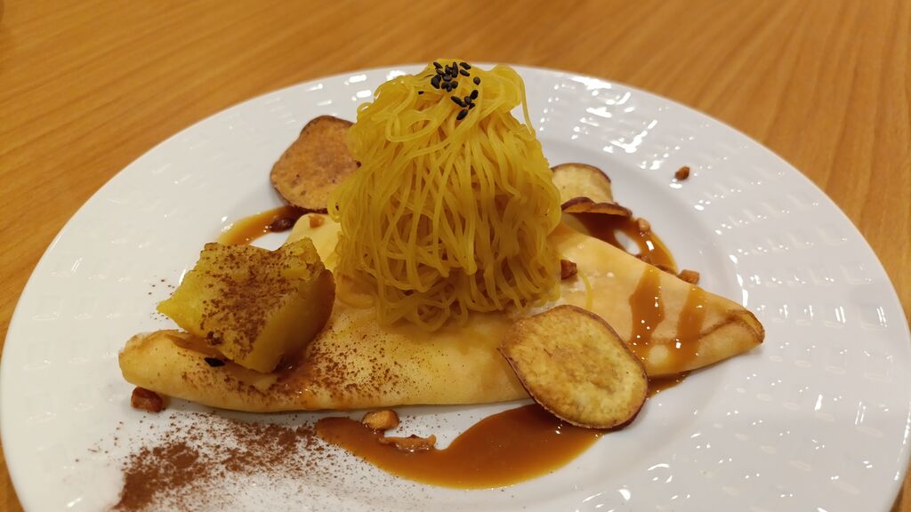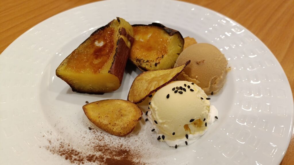 散歩の帰り道に見つけてしまったぁ~(笑)POPに惹かれてデザートタイム٩(ˊᗜˋ*)و期間限定の《おいもンブランのクレープ》と《焼きいもブリュレ》を注文~♪もちもち生地のクレープの中にホイップ&カスタードが入っている。【紅はるかのモンブラン】、【ひとくち焼きいも】、【おいもチップス】とクレープの周りはおいもづくし~♫モンブランにはホイップ&バニラアイスが隠れてる。黒ごまの風味もアクセントになって全体的にバランス良く贅沢~(*ˊ˘ˋ*)♪表面がパリパリになった食感が楽しめる少し温かい焼きいものブリュレには塩キャラメル&ナッツアイスとバニラアイスが添えてあり、おいもとアイスを絡めながら食べるハーモニーは最高に相性いい~(ૢ˃ꌂ˂⁎)皮までペロリと完食♪どちらも季節を感じれるデザートで大満足でした!!