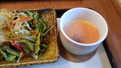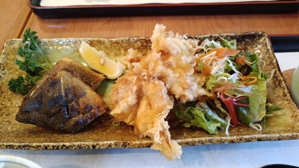 席は満席で待つ事10分位。店員さんに確認し限定ランチが残っていたので迷わず決定~♪【平日限定ランチ(10食限定)¥1300】ホッケ焼き、国産鶏の天ぷら 茶碗蒸し 小鉢 香の物 水菓子 コーヒーがセットになっていて魚も肉も両方ゲットでメチャお得(笑)ホッケ焼きはちょうど良い塩味で添えてあるレモンをかけてさっぱりと!鶏の天ぷらはサクサク~和のソースが相性バッチリでご飯すすむ~٩( *˙0˙*)۶オススメ!デザートの水菓子に飾られた猫型の寒天は、店主が猫好き~が理由みたいです(ૢ˃ꌂ˂⁎)コーヒーにもこだわりがあって益子珈琲を使用していて最後まで贅沢な時間を過ごしちゃいましたぁ~♪♪また接客がとても感じ良く笑顔が素敵で居心地の良いランチタイムでした。ご馳走様でした♬