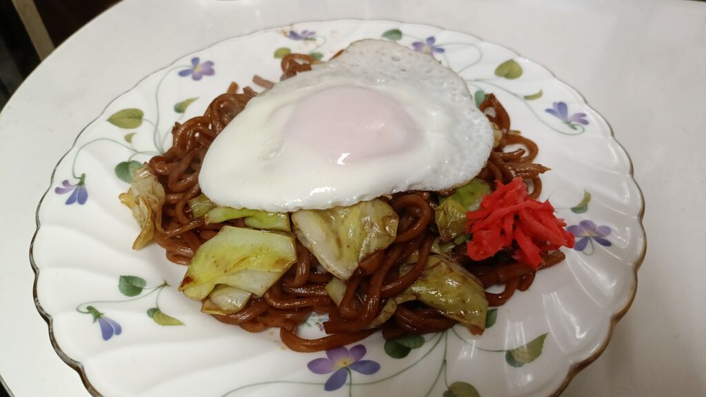 お店のドアを開けて入った瞬間スパイシーなソースの香りが漂っていましたぁ~(◍︎´꒳`◍︎)具はキャベツのみのシンプル焼きそば♪トッピングに目玉焼きをチョイスして 頂きまぁ~す(*´༥` *)ソースは甘めで旨味がしっかりあり 麺はモチモチ食感が最高~シンプルだけど私好みの焼きそばに出会えて幸せ~( ꈍᴗꈍ)卓上には後がけソースや青海苔、紅しょうが、こしょう、七味唐辛子があるので自分好みに味付け出来るのも嬉しい♪目玉焼きをトッピングしてもワンコイン以下なのでコスパ最強でオススメですദ്ദി>ᴗ<)♪