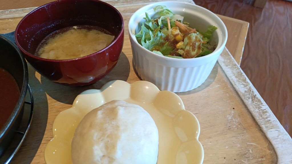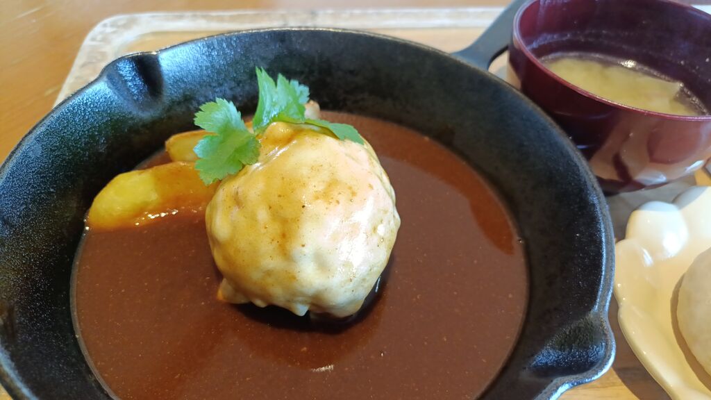 体がハンバーグをずっと求めていて連れて来てもらった場所♪のどかな田舎風景の中に ふと見えて来た可愛らしいお店&看板を発見(Ꙭ )!!店内はやわらかな照明で落ち着ける雰囲気。お座敷に通され、窓から見えるのどかな田舎風景にも癒される~( ꈍᴗꈍ)メニューは豊富で悩んだけど【チーズハンバーグランチ】に米粉パン(クッペ)を選び注文♪コロンとまん丸ハンバーグに被ったチーズに感動しちゃいましたぁ~(笑)ハンバーグの食感は柔らかくお箸がスーッと通ってしまう位。濃厚なデミグラスソースを絡めながらパクパクと箸が進み、あっという間に完食(笑)米粉パンはもちもち食感で歯ごたえがしっかりあってハンバーグと同様にデミグラスソースを絡め浸しながら食べちゃいました(*´༥` *)全体的に優しい味わいでホッと出来る贅沢ランチを頂き、心まで大満足させてもらいました(ૢ˃ꌂ˂⁎)