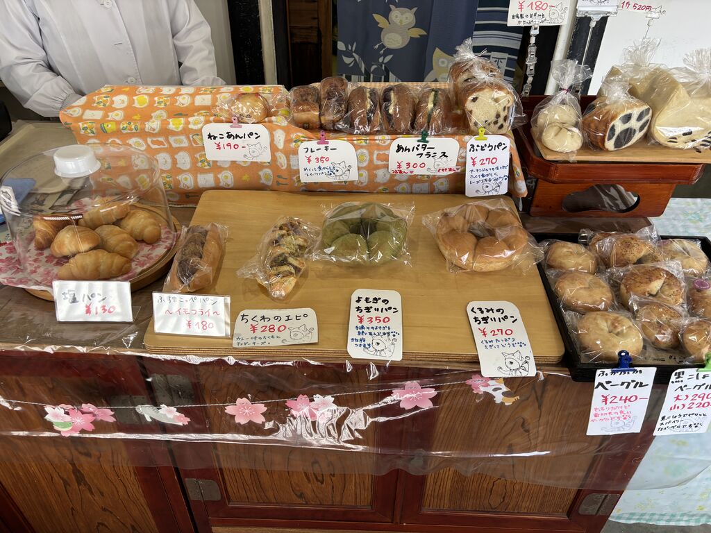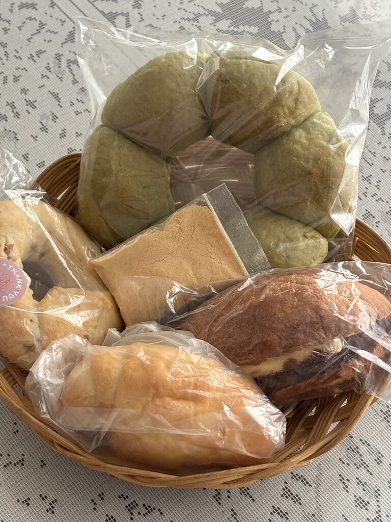 今日は土曜日しか開いてないパン屋さんに行こう 売切れ閉店だから午後3時ジャスト 空いてました お店に入ってよもぎパンを見ているとオーナーとお母様がよもぎパンにきな粉を付けて召し上がってみてくださいとのおすすめがあり頂きました いっしょに桃のお茶もどうぞですって。嬉しい 頂くと確かにきなこ合います 早速ちぎりよもぎパンにくるみベーグル 塩パンを購入しましたら硬めのパンどうですかとオーナーさんのご配慮でフランスあんバターパンを頂いきました 自宅で頂きましたがとてもヨモギの香りがして美味しく頂きました そういえばオーナーのお母様が朝 よもぎを摘んできてらっしゃると話してました 今回は売り切れてしまいましたがよもぎアンパンを頂きたいと思います 気遣いのご配慮ありがとうございました