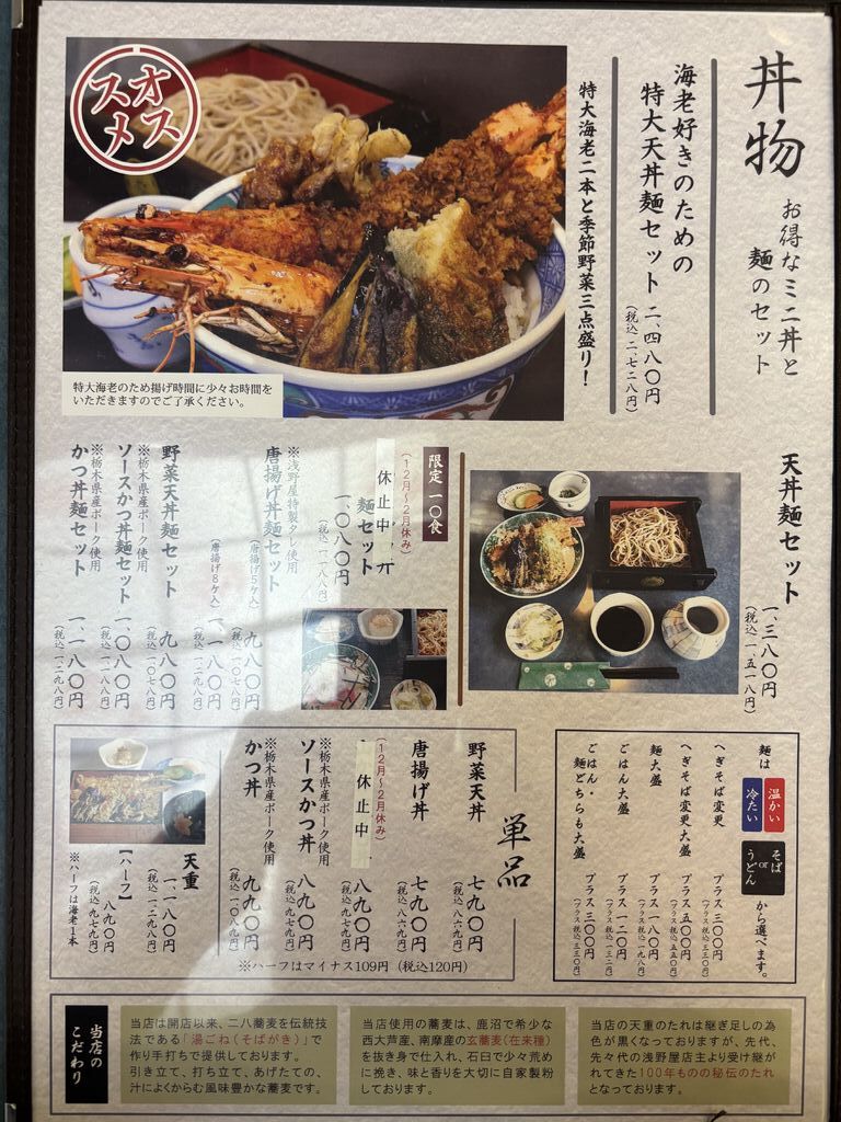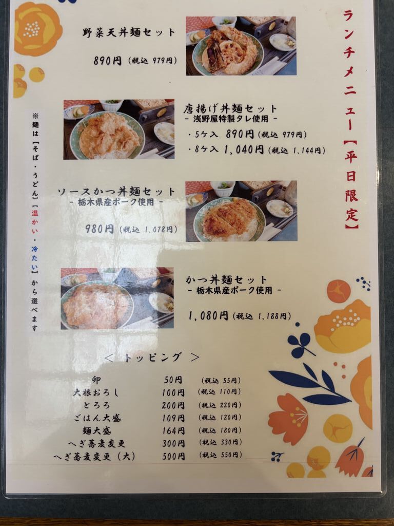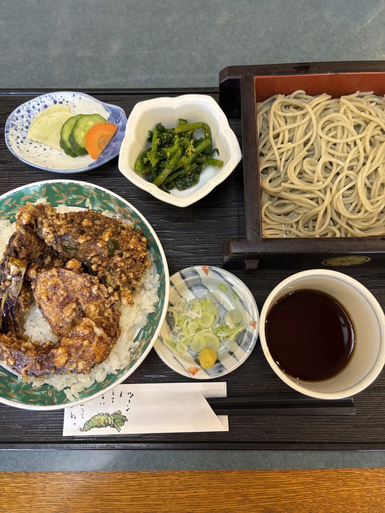 ずっと食べたかったへぎそばです お水を使わずに布海苔をつなぎに使用してるお蕎麦 北関東では浅野屋さんだけ へぎそばと天ぷらセットは多いかな ランチで天丼と蕎麦のセットがあり お蕎麦をへぎそばに変更可能との事 しかも300円アップのみ 因みにランチセットは驚きの890円 今のランチ事情からは考えられないですね へぎそばは布海苔のつなぎだから少し硬め 違った…コシがあるですね 笑 野菜天丼も野菜がナス かぼちゃ 舞茸 ピーマン さつまいもの5種類 副菜のからし菜がアクセントでピリ辛 そうですよね からし菜ですわ お店の内装も趣きがあって お蕎麦の美味しいが増しました 美味しく頂きました ご馳走様でした