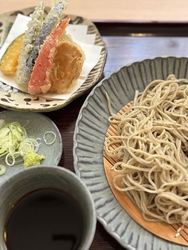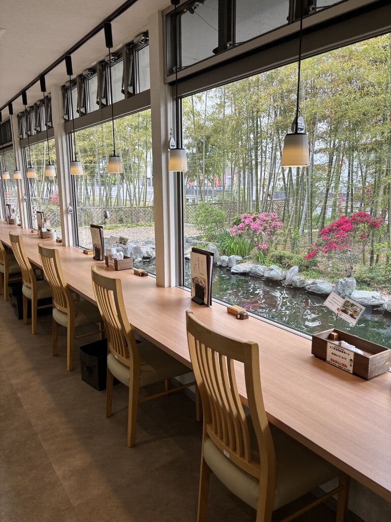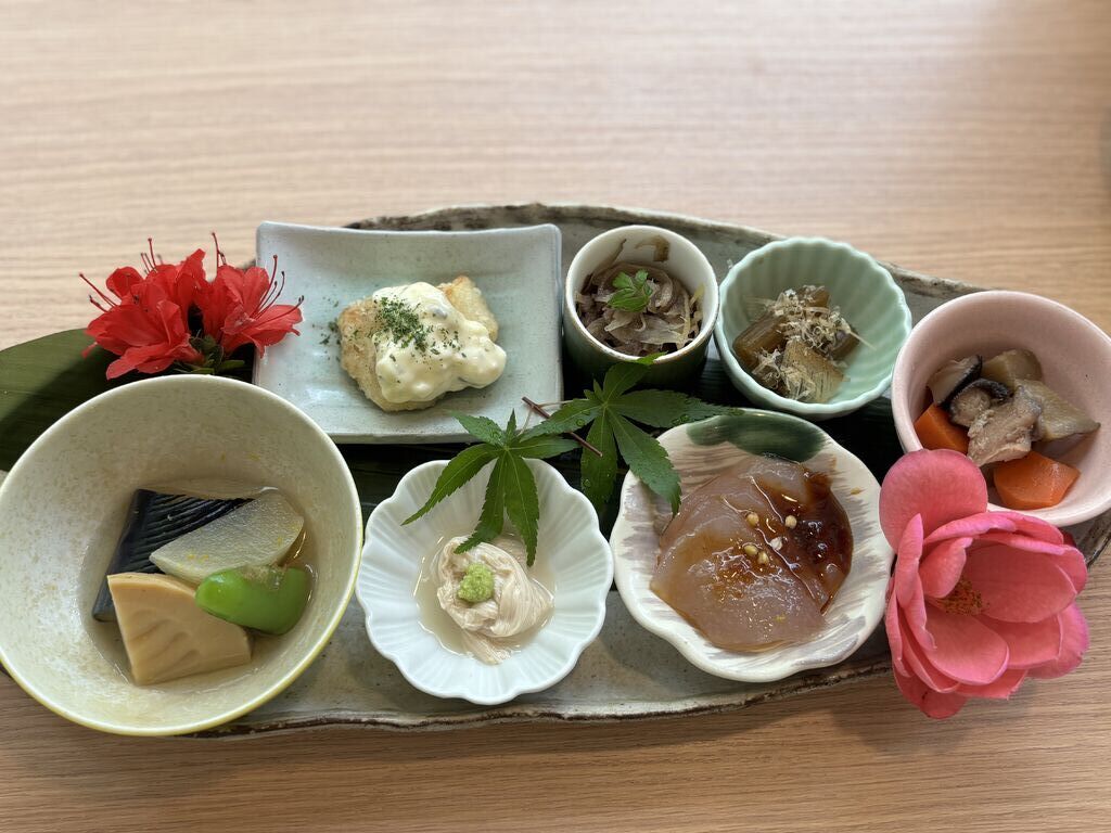 蕎麦好きには以前から気になっていた若竹さんで1番乗りでのランチ 笑笑 お蕎麦屋さんのイメージではなく おしゃれなカフェって感じです 早速数量限定の若竹前菜セットを注文 季節にあっあ前菜は筍にふき 他に魚のマヨネーズ焼き 牛肉と牛蒡の甘辛煮 筑前煮 刺身こんにゃく 湯葉が彩り良く 素敵な器に盛り付けてあります あしらいの花は牡丹にツツジ お上品な薄味 牛肉は濃いめと味のメリハリがしっかりとしていて美味しい 必然とお蕎麦も美味しいんだろうって気持ちが高揚してきます 案の定 お蕎麦もコシがあり 天ぷらもカラッと揚がっていて美味しい 天ぷらは野菜メインでパプリカ ナス かぼちゃ 筍ともうひとつありましたけど夢中で頂き忘れました 食事の頃合いを見てデザートの抹茶プリンとアイスコーヒーが運ばれました カウンター席での食事は窓から目の前に池があり鯉や周りにはツツジにお店の屋号そのままの若竹が見えました この季節は寒くなく暑くなく ごゆっくりの言葉に甘えてゆったりしました 外には何人もお待ちになっており ちょっとゆったりとしすぎました それほどに居心地がよくスタッフの方々もとても感じがいいです またお伺い致します