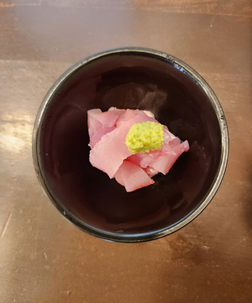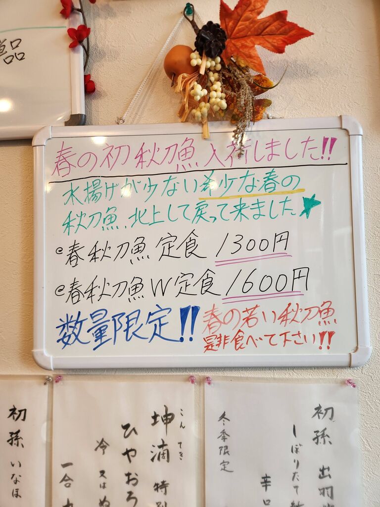 今日はてうし水産のインスタで春の秋刀魚は希少です。是非ご賞味下さいと。そんな訳でイタリアンに行こうと思っていましたが、てうし水産に行ってきました。11時に営業中の看板を待って入店です。インスタを見て来ましたと、春の秋刀魚W定食1,600円をお願いしました。出来上がる間に、店主から鮪の腹の皮のところの肉を味見させて頂きました。さて、秋刀魚W定食が出来上がりです。秋の秋刀魚に比べ少しお腹の辺りが痩せていますね。味は変わりませんね。思いがけなく春に秋刀魚を楽しみました。今度は、カジキマグロの中落ちをサービスで食べさせて頂きました。これも、あれも美味しかったです。ごちそう様でした。