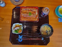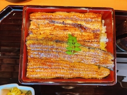 今日はひょんなきっかけから、藤岡町の共水うなぎ専門店せしもに、電話し急遽行くことを決めました。開店15分前に駐車場に到着。お店の外観写真を撮っていると、少し早いですが店内でお待ち下さいと、お茶をいれてくれました。暫しご主人と共水うなぎ専門店の話しなどさせていただきました。間もなく先付けの稚鮎の甘露煮、白和え、つぶ貝が配膳。続いて熱いですよと鰻ボーン。それから野菜の揚げ浸しと続きました。しじみの味噌汁と野菜が飾り切りされた漬物が準備されたところにうな重が配膳です。蓋を開けると綺麗に整った美味しそうな鰻が登場しました。山椒を掛け一口。丁寧な仕事が共水うなぎを引き立てます。間違いありませんね。食後の自家製デザートまで、細かく気配りの接客も特筆でした。今日は私の他にお母さんを連れた息子さん1組と空いてましたが、明日の日曜日はお断りするほどの満席と言っていました。会計は現金で鰻重の並8,800円でした。ご主人と奥様にお見送りをいただき車に乗りました。