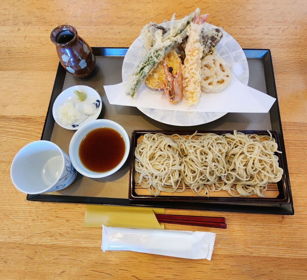 今日はリストランテと鰻屋さんのご主人から薦められた野木町の蕎麦切りわたなべに行ってきました。10前に誰もいない駐車場に駐車していました。ウェーティングリストに名前を記入し待機。後から3人連れのお客様が来ました。開店しカウンターに案内されました。注文は活車海老と季節野菜の天ぷらが付いた天せいろ2,200円をお願いしました。間もなく出来上がりました。天ぷらはボリュームがあります。インゲン豆、さつま芋、はす、舞茸が二つと活車海老です。天つゆと塩が付きました。満腹になりましたが、とろみの有る蕎麦湯を飲んで、pay pay で支払いを済ませました。