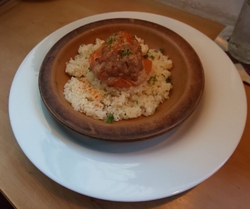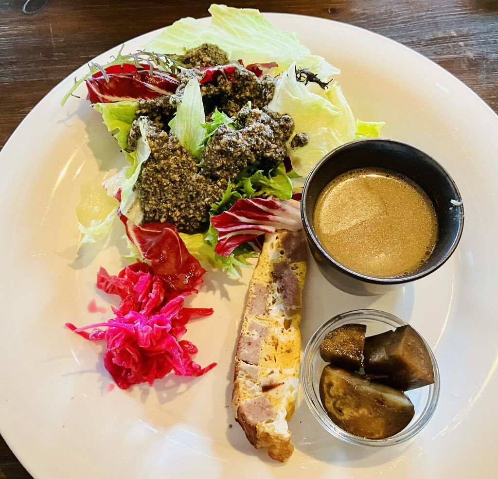 新里のフランスバスク地方の料理店に久しぶりの訪問です。開店と同時だったので予約なしでカウンターに座れました。注文は私が「メニューA 2,985円」妻が「メニューB 1,985円」前菜、パン、メイン、ドリンク、デザートにAは黒麺のパスタが付いてます。私が「豚すね肉の煮込みポトフ仕立て」「アイスティー」「本日のデザート」妻が「粗挽肉のトマトファルスと バターライスのオープン焼き+100円」「コーヒー」「本日のデザート」前菜どれも良いですね。ゴマのドレッシングも牛蒡のスープも素材感が気に入りました。メインの肉も柔らかくて優しい味付けで美味しかった。 (訪問:2021/10/24)
