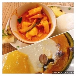 日曜日のランチタイムに初来店。予約して伺いましたが、店内は予約客でほぼ満席でした。本日のコースメニュー(1人1750円、2名〜をチョイス)。写真撮り忘れましたがトムヤムクンが辛すぎず海老の出汁がきいていて美味しかったです!写真のパイナップルカレーとかぼちゃプリンもとっても美味しかったです♪ (訪問:2020/08/30)