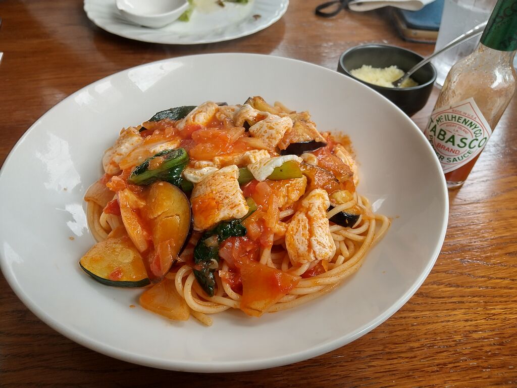 ランチで伺いました。前菜のサラダはボリュームたっぷり、デザートは黒蜜のかかったコーヒーゼリーで特にこちらがお気に入りです。パスタはイカとトマトソースのパスタを注文しましたが、イカがたっぷりと入って美味しかったです。 (訪問:2023/07/01)