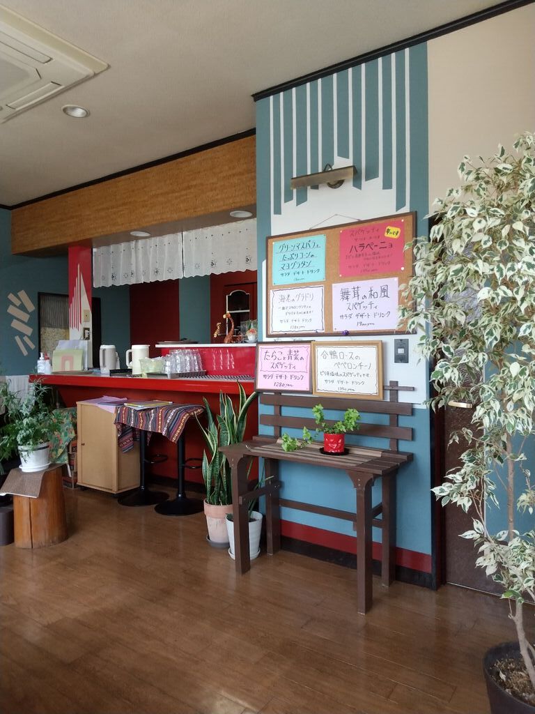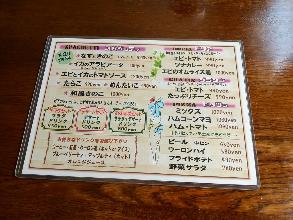 母の通院の付き添いの帰り、お昼ごはんをいただきに伺いました。今回は、一番上の姉と県外から帰省していた4番目の姉も一緒です。ちょうどお昼時だったため、店内はお食事を楽しむ方々でいっぱいでした。何とか空いていたテーブル席に座り、どれにしようかとそれぞれ悩みに悩み、私は「あさりときのこのスパゲッティ1350円」を注文。他のテーブルでは、トマトスパゲッティとドリアorグラタンが選べる「ハーフ&ハーフ」が人気のようでした。最初に運ばれてきたサラダは、さっぱりしたドレッシングにあっつあつの生姜のスープ、シャキシャキのにんじんラペでビタミンチャージ。続いて運ばれてきたスパゲッティは、きのことあさりがたっぷり入っています。程良い塩加減に、ニンニクの香りが食欲をそそります。あまり外食をしない母も、ナスとトマトソースのスパゲッティを美味しそうに食べていました。食後には、ちょうど良いサイズのコーヒーゼリーが登場。生クリームにきな粉と黒蜜のトッピングが素敵です。食事をしている間も、次から次へとお客さんが来店されていて、地元の方々に愛されているお店なんだなーと、改めて感じました。美味しい幸せをありがとうございました。ごちそうさまでした〜。 (訪問:2023/12/07)