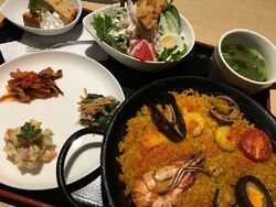 ママ友同士で子連れランチをしました!一階はテーブル、二階は座敷で人数によって貸し切ることができるようです☆ランチはメインの他に小鉢とスープ、ドリンク付き。この日は、パエリヤ、煮込みハンバーグ、スタミナチキン、イカスミカレーでした。880円〜1300円と値段も手頃。ただしどれも数量に限定があるようです。予約すればパエリヤとハンバーグは制限がないようですし、時間がかかるので予約をおすすめします♪ 家ではなかなか作れないパエリヤが食べられて満足!! (訪問:2015/05)