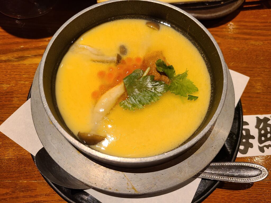 お気に入りの果実酒からあらごしみかん酒を注文しました。カキフライとやきとり盛り合わせ注文。カキフライはふっくら美味しくやきとりの中でもつくねは肉の感じが美味しいのでお気に入りです。前回来た時に気になった大人のクリームソーダ注文。他にもまだらの白子やあんきもなども美味しかったです。〆は海鮮茶碗蒸し!いくらやウニも乗っていてボリュームあります。 (訪問:2021/11/07)