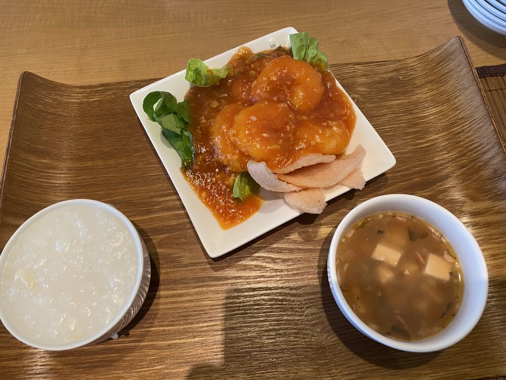エビチリが食べたくて、ランチに予約して訪問。エビチリランチ(¥1430)は、一口では食べられない大きいエビが沢山入って、とても美味しいエビチリでした。エビのダシが効いたスープ、お粥、2種類のスイーツそして、一回限りの7種の惣菜バイキング付きです。お惣菜は、大学芋や春雨、酢の物、サラダ他色々あって、どれも美味しいものばかりで、満足のランチでした。 (訪問:2025/06/16)