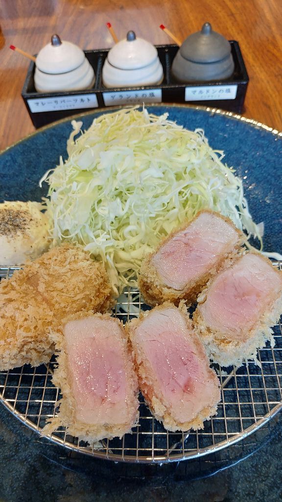 近くに用事があり、ランチを調べていたところ、こちらのとんかつ屋さんが気になり、初訪問。山泉楼さんの奥にあります。12時頃到着し、約2時間半くらい待ち。シャトーブリアンは2組前くらいで売り切れてしまい、上ロースかつ、上リブロースかつ、上ロースかつと大海老フライを注文。お肉の断面がうっとりするようなピンク色。3種のお塩と醤油、ソース、すだちをつけてお好みで。私は塩とわさびが気に入りました。ご飯、キャベツはおかわり自由!キャベツは細切りなのにシャキシャキですごく美味しい。ドレッシングも最高で、売ってたら買いたいくらいです。子供は注文がなくても、ご飯無料とのこと。一人前を食べきれない場合は、親の分を何切か分けてあげれば足りるのでありがたいサービスです。今度はもっと早く行って、シャトーブリアンをいただきたいです。 (訪問:2023/11/03)