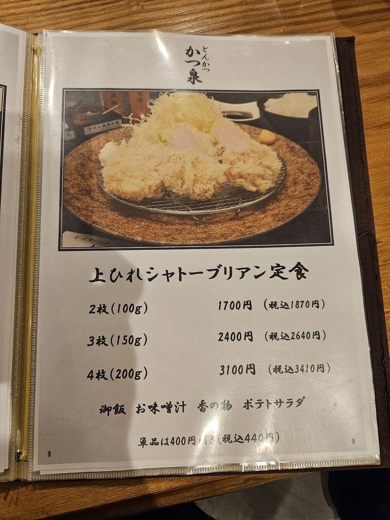 お昼に、かつ泉にて、カツ定食をいただきました。今回は、いただいたカツ定食について、お話をしたいと思います。いただいたカツ定食は、写真に掲載しました通り、上ひれシャトーブリアン定食になります。サクサクしたころもと柔らかいお肉のひれカツはとても美味しいカツでした。ソースや醤油だけでなく、様々なタレをつけていただくことができます。白いご飯との相性もバッチリで、本当に美味しいカツ定食でした。尚、キャベツとご飯はお代わりがあります。とても満足した昼食でした。皆さんも、是非、食べてみてください。今回も読んでいただき、誠にありがとうございました。 (訪問:2025/09/09)