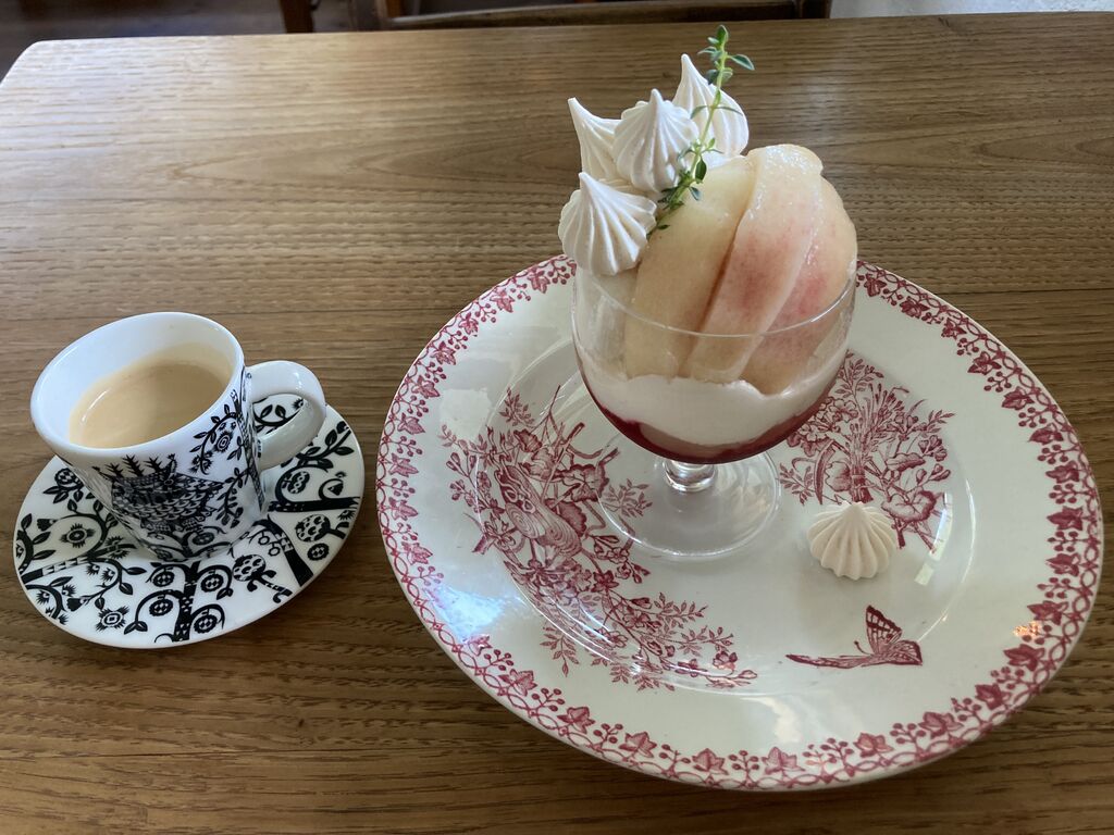ずっとずっと行きたかったカフェ。予約してお邪魔しました。カーナビを頼りに向かいましたが全く違う方向に進んでしまったようで挙げ句の果てに狭い道で四苦八苦。メッツァさんが見えた時は泣きそうでした笑ワンプレートランチは(ポークジンジャー)をいただきました。Instagramで桃のスイーツが可愛くて必ず頂こうと思ってたので追加注文です。ワンプレートには何種類ものデリが並び、全て美味しい。ポテトサラダに秋田名産の(いぶりがっこ)が入っていて食感のアクセントになり新鮮でした。ポークジンジャーも肉厚でご飯が進む味わいでした。(桃のヴァシュラン)は想像以上の可愛さ!!!ムラングが見た目にも食感にもインパクトがありました。桃もネットリと甘くヨーグルトソースと一緒に食べても美味しさが際立ってました。2時間制ではありますが、本を片手にゆっくり美味しいランチタイムで癒されました。 (訪問:2021/08/27)