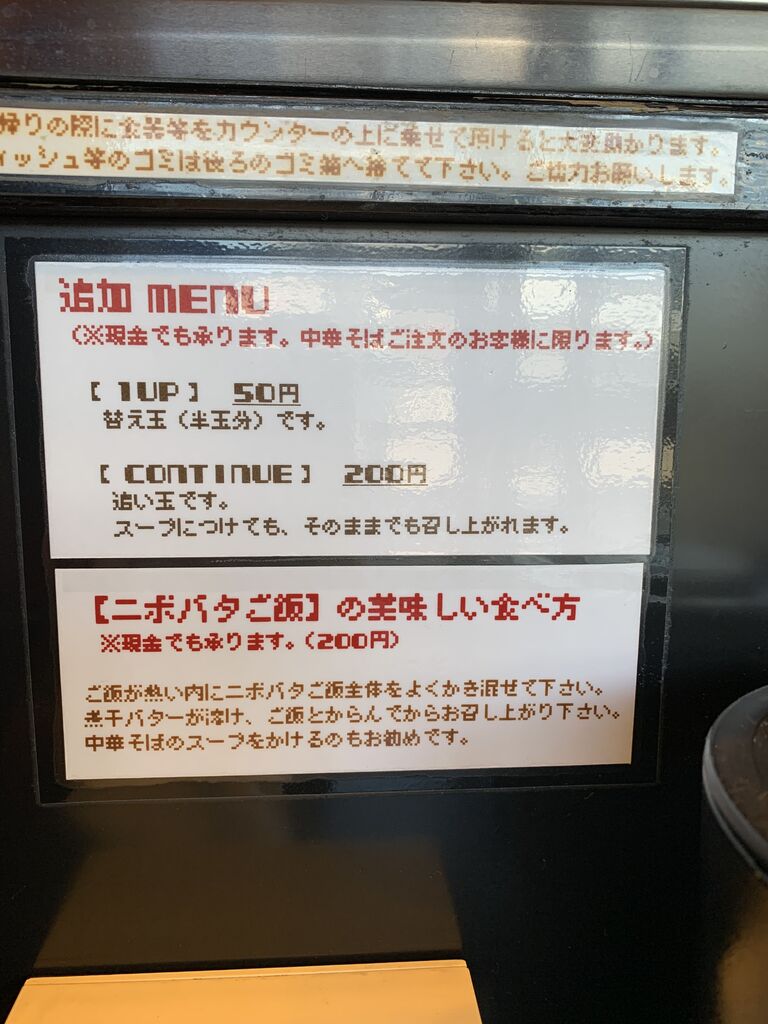 平日ランチタイム終了間近の初訪問でしたので「煮干し中華そばEASY」をオーダー。「HARD」は売り切れていました。「ニボバタご飯」が気になったので追加オーダー。ハート型の煮干しバターが可愛いです。券売機ではなく現金でもお支払いできます。ご飯多めでしたが残ったスープに入れて最後まで美味しくいただけました。 (訪問:2020/11/04)
