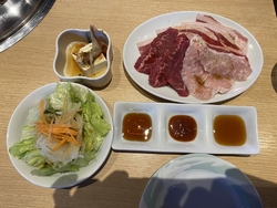 息子がランチに誘ってくれ、4人で訪問しました。私は寒かったので選べるランチの石焼辛クッパを。クッパ、お肉3種、サラダ、スープ、小鉢、デザートでは杏仁豆腐を。提供は早かったです。辛過ぎないクッパは食べ応えが有り、お肉や野菜も入って食べ易く、身体もポカポカ状態。お肉は種類ごとに、タレをつけて食べました。レモンのタレがさっぱりして良かったです。さくらパスでお肉をサービスしてもらい、楽しいランチを過ごしました。自宅から近いので利用頻度は多いのですが、足が不自由な母を、掘りごたつ様なテーブル席には、帰省している息子が居ないと引き上げられないので、伺う時は息子の帰省の時だけです。写真は頼んだ選べるランチとさくらパスで頂いたお肉です。 (訪問:2025/11/26)