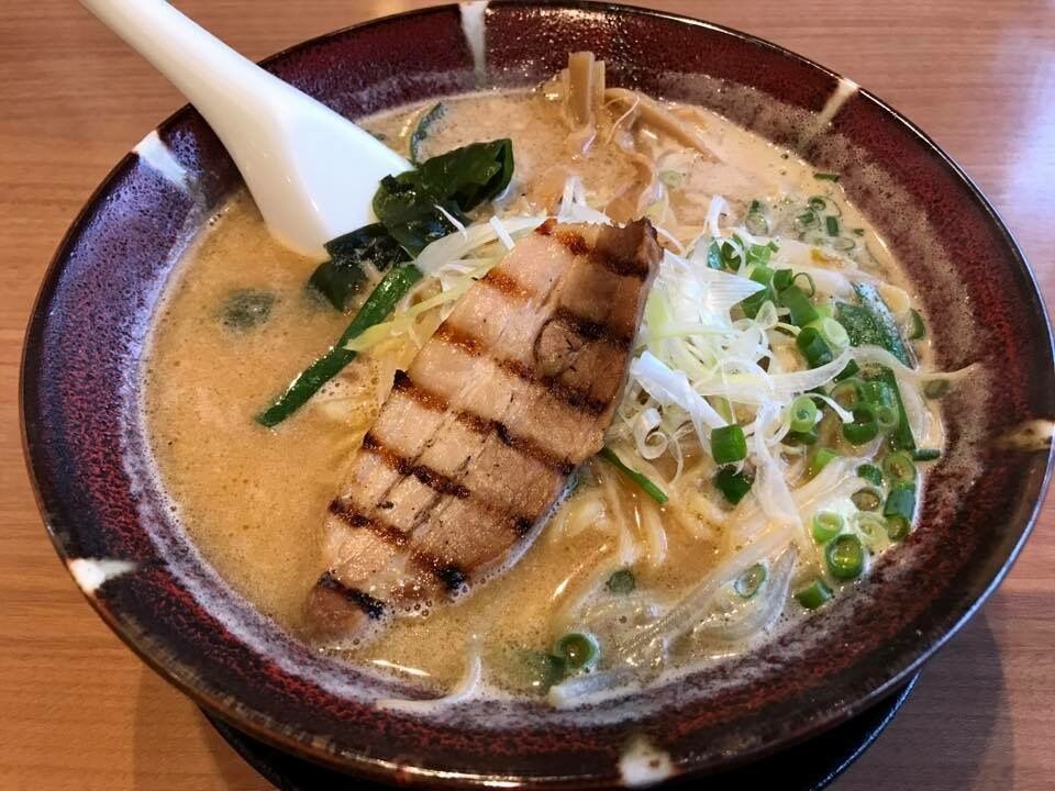 この店舗は初めての来店です。いつもの「チャーシューなし味噌ラーメン」を注文しようとメニューを見ると、それが見当たりませんでした。スタッフに効くと、メニューの改定があったそうでなくなり、代わりに「元祖味噌ラーメン」を注文しました。届けられたラーメンは、湯気をもうもうと立ち昇らせて、炙りチャーシュー、わかめ、メンマ、ネギのトッピングがありました。スープの味を確かめます。いつもの味で安心しました。麺は中太丸麺で、スープとよく絡み、具との相性も抜群でした。2/3程食べ進めた後、ラー油、生姜を混ぜ、味変ラーメンの出来上がり。スープ一滴も残さず飲み干して完食しました。 (訪問:2019/01/06)