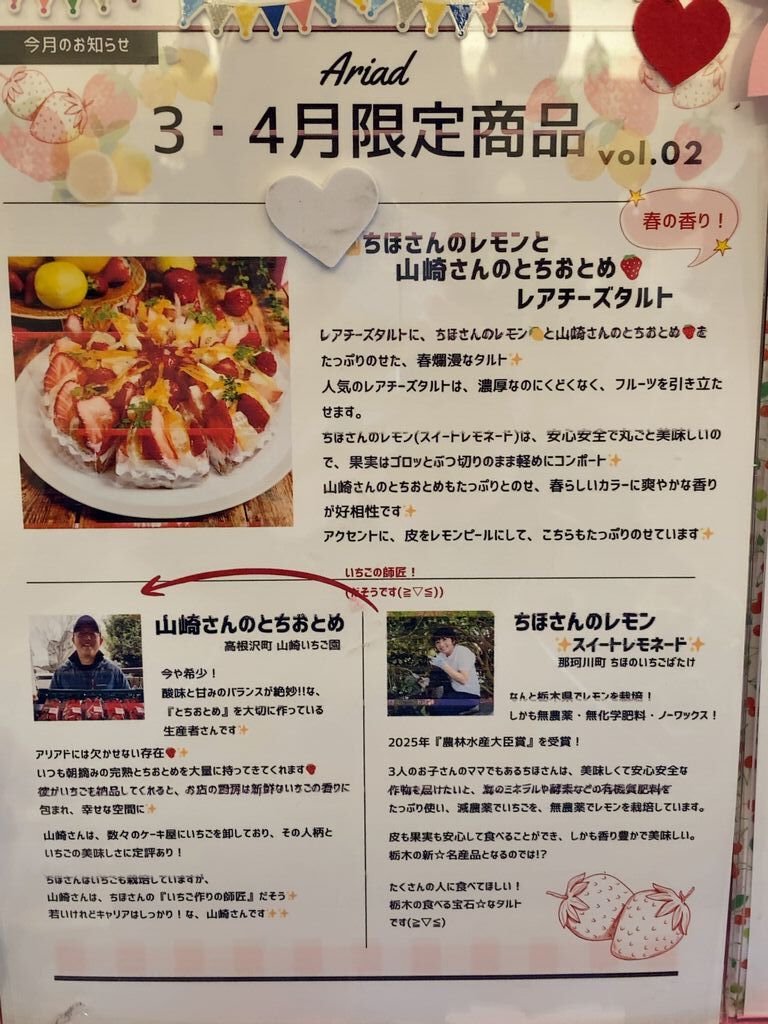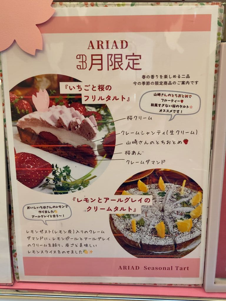 予約をしてとちおとめのタルト、いちごと桜のフリルタルト、おさつまモンブランタルト等をテイクアウトしました。夕方来店したら、ショーケースの中にケーキがほとんど残っていなかったので、予約がオススメの人気店です^ ^ (訪問:2026/03/23)