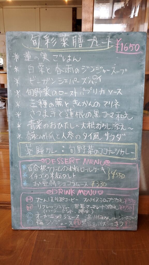 ここのところ食が乱れていたのでリセットをかねてランチにと12時半頃お邪魔しました。ちょうど出られた方が居たのですぐに着席。カレーも気になったのですが、やっぱりここに来たら『旬彩薬膳プレート1650円』を。今日も様々なお野菜が使われたいろんな味付けの彩豊かなプレートに無心でモグモグ☆よく噛んで、いろんな食材の味や工夫された味付けをしっかり堪能。蓮の実ご飯がモッチモチでとっても美味しく、冷めてもモチモチなのにビックリでした!この時期嬉しい生姜の効いたスープが身体を暖めてくれるし、さつまいもと蓮根の黒ゴマ和えがとってもこのみの味と食感で是非とも真似したくなりました^^旬のお野菜を惜しげもなく使っていてからだに優しい美味しいランチを堪能できちゃいました! (訪問:2019/12/28)