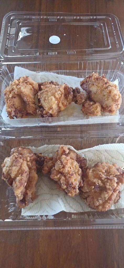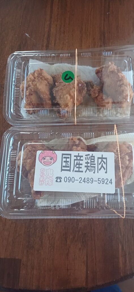 公園帰りの遅めのランチに伺いました。残念ながら白米が終了してしまったとのことで、唐揚げのみテイクアウトしました!揚げたてで、ジューシーで美味しかったです。ペットボトルのドリンク類も安かったです。会計後に味付き氷入りのレモンソーダのメニューを発見!次回はこちらを注文したいです。店員さんが鬼嫁さん?とっても感じの良い方でした。 (訪問:2022/04/10)