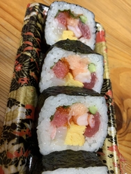 美味しそうなお寿司を見つけました。8種類の彩り海鮮巻き。税込429円。海老、胡瓜サーモン、マグロ、イカ、たまご、とびこ等海鮮がいっぱいです。お寿司大好きな人におすすめします。5個入りです (訪問:2021/07/18)