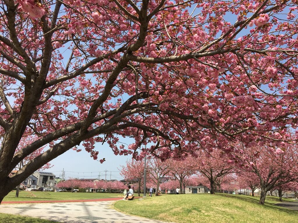 八重桜が満開でした。舗装された道の両側に八重桜の木が植えられており、トンネルのようになっていました。公園全体が濃いピンク色で染まっていて風流でした。まさに八重桜が「にほひぬるかな」です。お花見をしている方や写真を撮っている方がたくさんいました。 (訪問:2025/04/22)