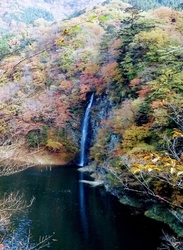 観瀑台からの眺めです。落差約40mの滝は紅葉した木々の間を枝垂れるように箒川に落水しておりました。周囲の自然も含め絵になる美しい滝です (訪問:2023/11/05)