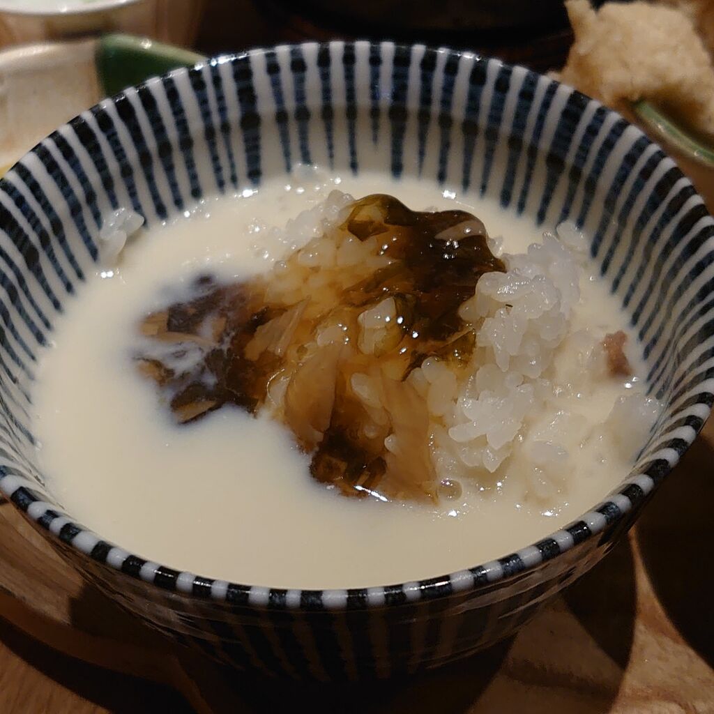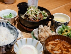 予約不可の行列の出来る人気店、並んでランチに伺いました!並んでいる時にメニューを渡して頂き、先にオーダーを取って頂くシステムです!甘辛ネギハンバーグ定食にして、単品で超大粒カキフライをオーダーしました!ハンバーグは色々なソースから選べます!トッピング等もありますよ!定食には小鉢が種類と炊き込みご飯or白米、茶碗蒸し、唐揚げ、味噌汁等がついてきます!大きなカキフライはぷりぷりで新鮮!粗挽きのハンバーグは熱々の鉄鍋で提供されます。レアに焼かれジューシーで美味しく、炊き込みご飯もふっくら、小鉢もされぞれ美味しかったです!希望で、ご飯を少し残して豆乳茶漬けにして頂く事が出来ます!岩のりと生姜のジュレもかけて頂け、こくとマイルドが合わさっりとても美味しいので、お勧めです!次々にお客様が来店、テイクアウトの方々も多かったです!カウンターだったので手際よい工程が見られ、楽しくお食事を頂くことが出来て良かったです!店内は店員さんが声を掛け合って、調理や接客をしていただけるので、気持ちよくお食事が出来ます!オーダーを聞いて頂く時も、苦手なもの有りますか?と聞いて頂け、きのこ類がダメなので、小鉢をきんぴらに替えて頂けました!対応がとても手早く、色々気配りも丁重です!さすが大人気のお店ですね!おすすめの美味しいお料理のお店です! (訪問:2024/04/19)