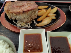 職場の人達とランチというか、1年間お疲れ様ということで、食事に行ってきました!いつも、お店の外で多くの人達が待っているのを見かけていたので、入店出来て良かったです。食事は、色々と悩み、女性4人で鉄板ローストポーク定食(半ライス)に、チャレンジしました(笑)食べきれない時は、持ち帰りOKということなので(≧∀≦)おしゃべりしながら待っていると、熱々の鉄板で想像以上のボリュームにビックリΣ(゜д゜lll)お隣のテーブルのお客さん達も、驚いていました!早速、一口大に切り特製ソース(2種類あり)に付けていただきます。お肉は、低温調理という事で、柔らかくジューシーで、お肉の旨みも感じました。味噌汁は、豚汁で濃厚具沢山でした。やはり食べきれず持ち帰り、夕食として、美味しくいただきました。ご馳走様でした (訪問:2024/12/26)