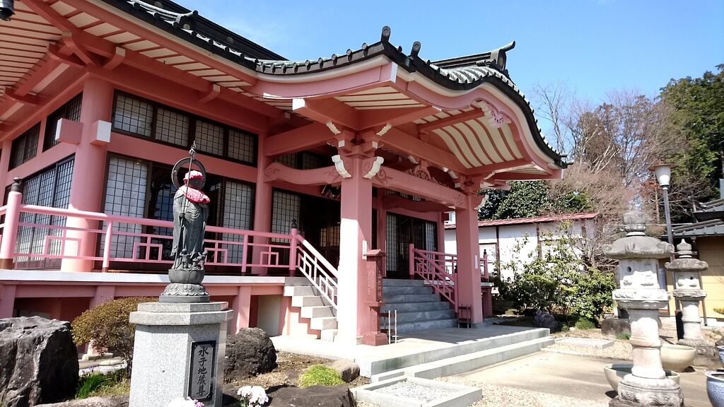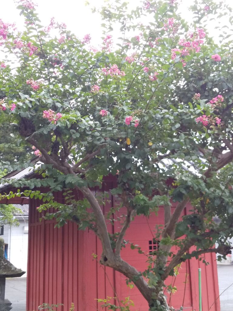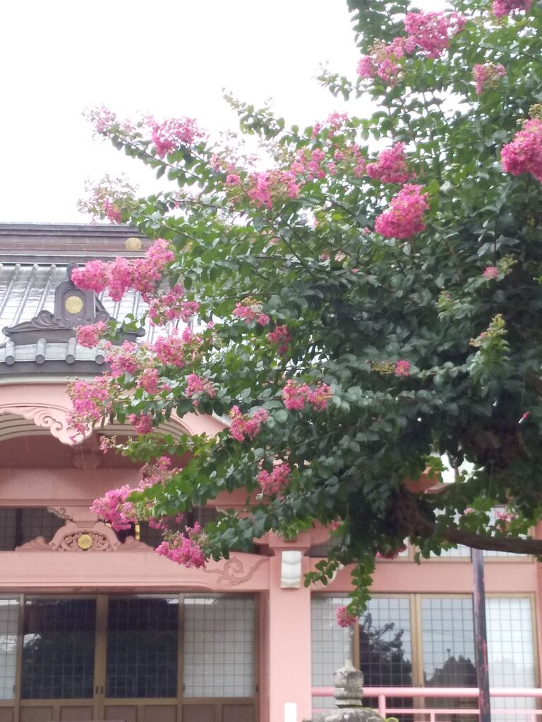 サルスベリのピンク色の花が桃色の本堂を引き立てており実にオシャレなコーディネートです。朱色のお堂の側にもサルスベリがありヤハリ同系色で同様に引き立てていました。境内にあるこれまたピンク色のハスは12時近くだったこともあり残念ながらしぼんでいました。有名なシダレザクラも含めピンク色に特化しており優しさと華やかさを持ち合わせた印象のお寺です。 (訪問:2020/07/26)