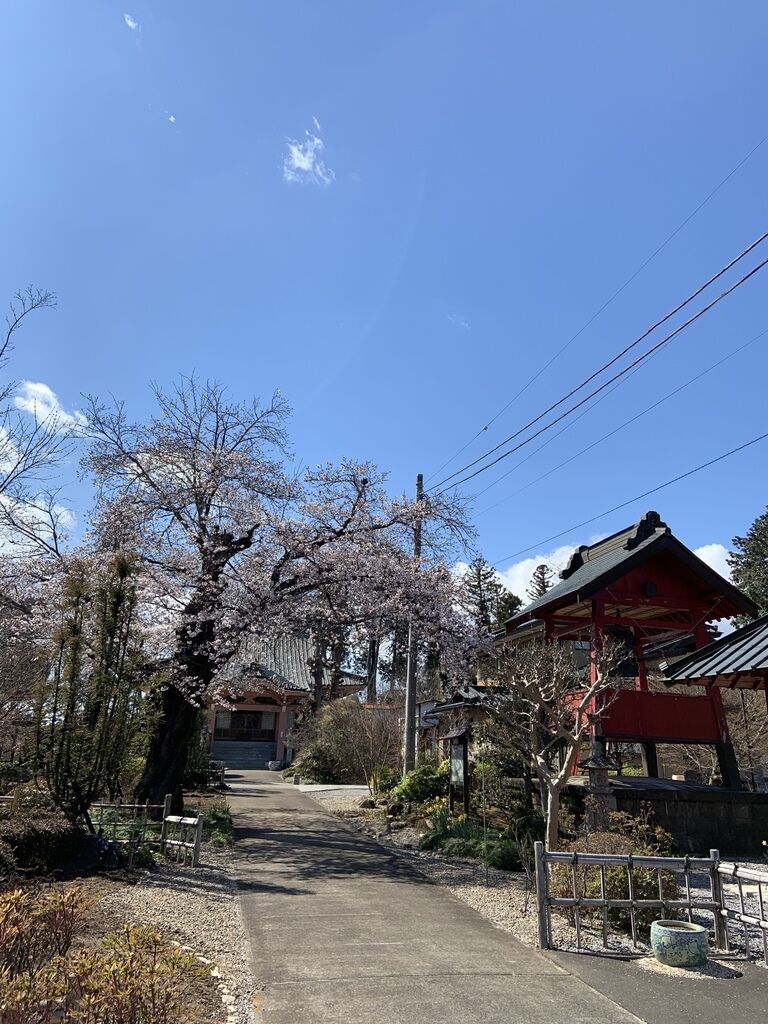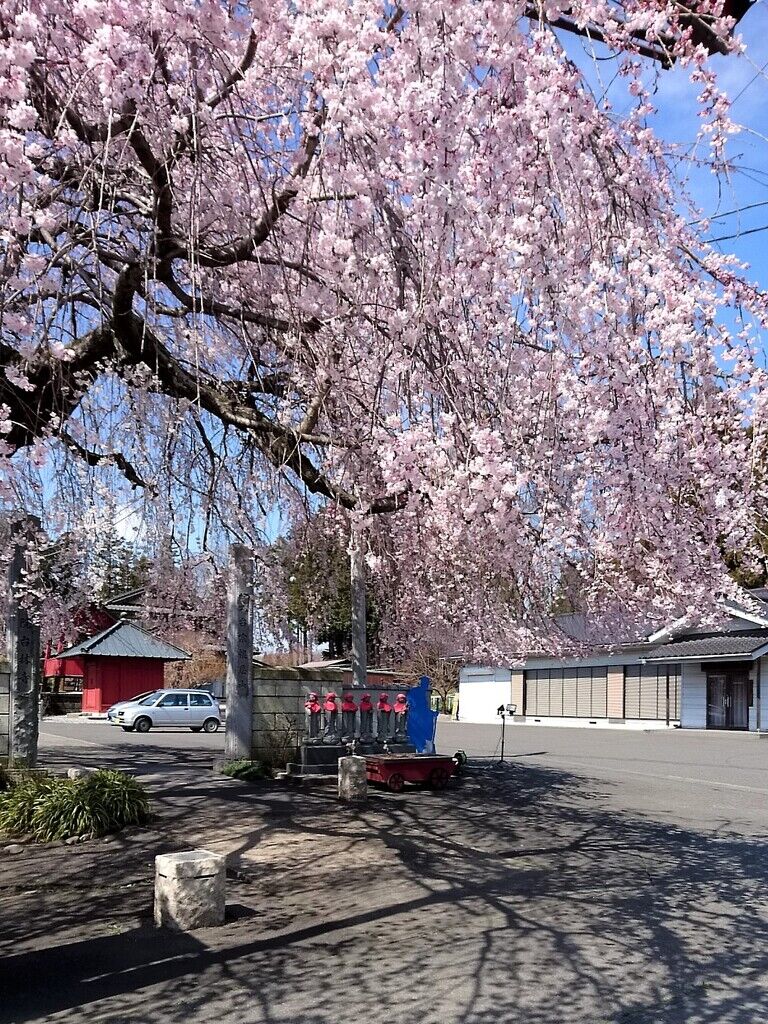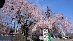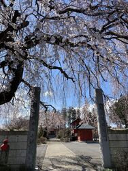 小山桜100選 樹齢100余年のシダレザクラが3~4部咲きに咲いておりました。普段は勇壮な出で立ちの木ですが更に美しい衣を纏っていて鬼に金棒だと思いました。県道沿いにあるので立ち寄る人が後を絶ちません。境内のソメイヨシノも開花しておりました。コチラも結構な年数が感じられます。サクラだけでなく本堂もサクラ色の外観をしているのでサクラが咲かない時期でも年中サクラを思い浮かべられるお寺です。 (訪問:2022/03/27)